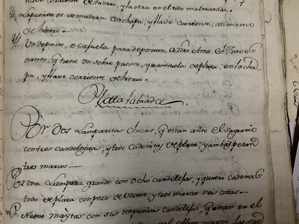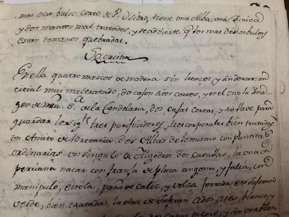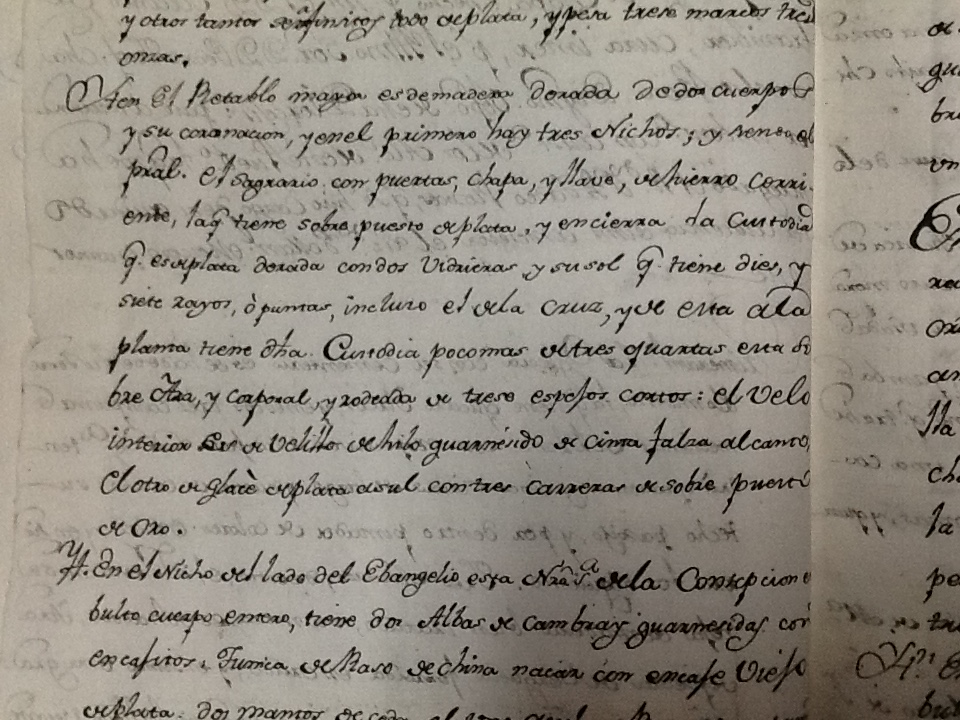 Libro de inventario realizado en el año 1792 por el cura Jacinto de Araníbar en el que se recuentan las alhajas y bienes de cada uno de los templos y capillas pertenecientes a la doctrina de Codpa, ubicados en los pueblos de Codpa, Pachica, Esquiña, Tímar, Ticnámar, Saxámar, Humagata y Livílcar. Aquí se recuentan cerca de 800 elementos, correspondientes a santas imágenes, vestimentas sacerdotales y de imágenes, accesorios, platería y mobiliario, y se describen cerca de 60 tipos de materiales distintos.
